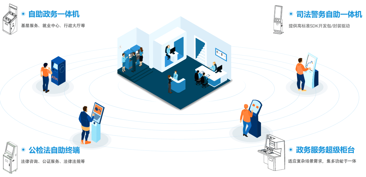 此設備主要用于智慧政務大廳,用于業(yè)務查詢、登記信息、充值繳費、發(fā)票打印、票據(jù)打印、綜合信息等常見業(yè)務。采用雙屏設計,操作區(qū)根據(jù)人體比例設計,操作順暢體驗好。